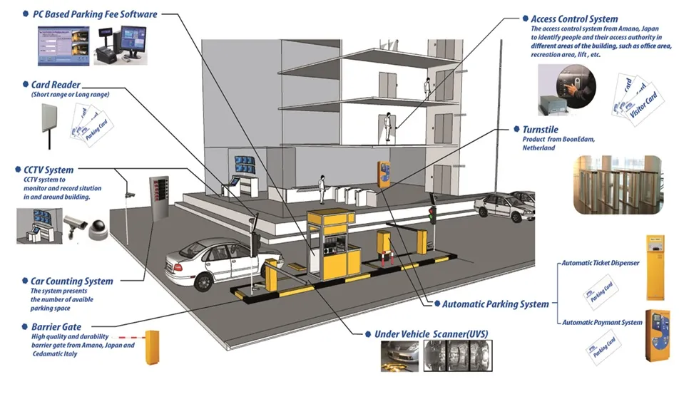 ระบบบริหารลานจอดรถเป็นระบบอัจฉริยะที่ถูกพัฒนาขึ้นมาเพื่อช่วยอำนวยความสะดวก และทำให้การบริหารจัดการลานจอดรถมีประสิทธิภาพมากที่สุด ซึ่งเป็นระบบที่คอยควบคุมการทำงานของระบบความปลอดภัยต่างในลานจอดรถทั้งหมด ไม่ว่าจะเป็นระบบกล้องวงจรปิด CCTV ที่ทำให้คุณสามารถตรวจเช็กสถานการณ์ และ Capture เก็บภาพทั้งภายในและรอบ ๆ ลานจอดรถได้ทุกซอกทุกมุมแบบ Real Time ไว้ในฐานข้อมูล เพื่อเตรียมรับมือและให้ความช่วยเหลือกับเจ้าของรถเมื่อเกิดเหตุฉุกเฉินได้อย่างทันท่วงที ระบบ Card Reader ที่ทำหน้าที่อ่านและสแกนบัตรหรือป้ายทะเบียนรถเพื่อใช้งานระบบไม้กั้น ระบบ Display ที่คอยอัปเดตจำนวนรถที่ใช้บริการหรือพื้นที่ว่างในลานจอดรถ ระบบ Loop Detector และระบบ Photo Sensor ที่ป้องกันไม่ให้ไม้กั้นตีทับรถผู้ที่เข้าใช้บริการลานจอดรถ ระบบลูกระนาด เสาจราจร และไฟจราจรในบริเวณลานจอดรถทั้งหมด